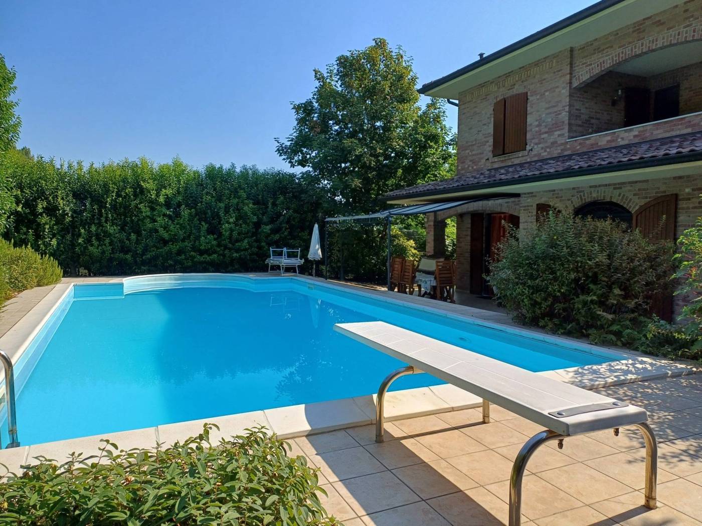 Il soggiorno ampio e luminoso, dotato di un camino, è il cuore della casa, ideale per momenti di relax in famiglia. La spaziosa cucina, perfettamente attrezzata, si affaccia su un portico che guarda direttamente alla piscina, offrendo uno spazio perfetto per cene all'aperto e momenti di svago.